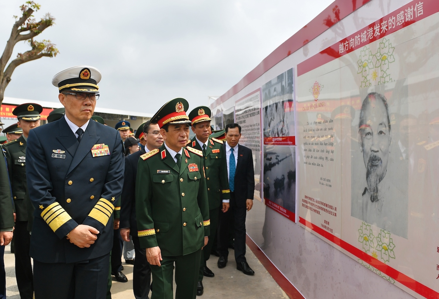 ທ່ານພົນເອກ ຟານວັນຢາງ ແລະທ່ານພົນໂທ ຕົງ ຈຸ່ນ ພ້ອມດ້ວຍຄະນະຜູ້ແທນສອງປະເທດ ໄດ້ໄປຢ້ຽມຢາມເຂດປູຊະນີຍະສະຖານ “ເສັ້ນທາງໂຮ່ຈີມິນ ເທິງທະເລ” ທີ່ທ່າເຮືອທ່ອງທ່ຽວ Fang Cheng, ຈີນ. ພາບ: qdnd.vn
