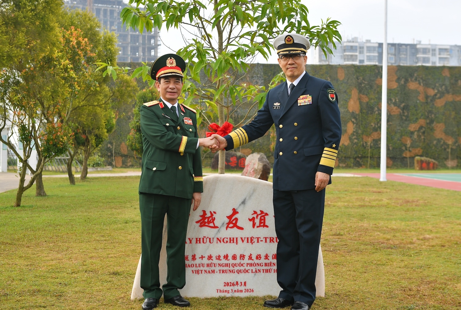 ລັດຖະມົນຕີກະຊວງປ້ອງກັນປະເທດສອງປະເທດ ປູກຕົ້ນໄມ້ມິດຕະພາບທີ່ກອງຮ້ອຍທະຫານຊາຍແດນ Dongxing, ຈີນ. ພາບ: qdnd.vn