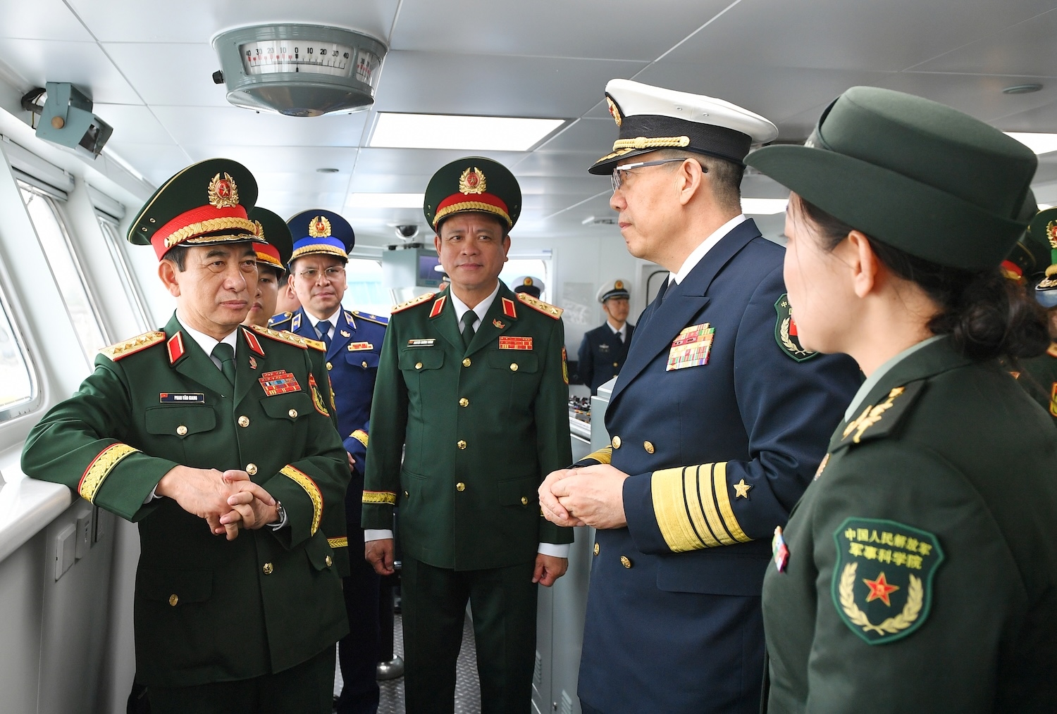 ທ່ານພົນເອກ ຟານວັນຢາງ ແລະທ່ານພົນໂທ ຕົງ ຈຸ່ນ ແລກປ່ຽນເມື່ອໄປຢ້ຽມຢາມກໍາປັ່ນຂອງທະຫານເຮືອຈີນ. ພາບ: qdnd.vn