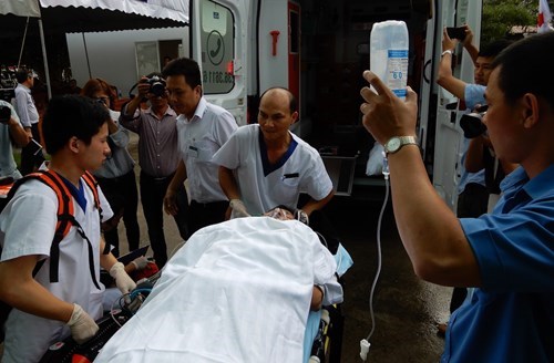 ກໍາລັງປະຖົມພະຍາບານສົ່ງຜູ້ຖືກເຄາະຮ້າຍອອກນອກ. ພາບ: ກິມເງິນ